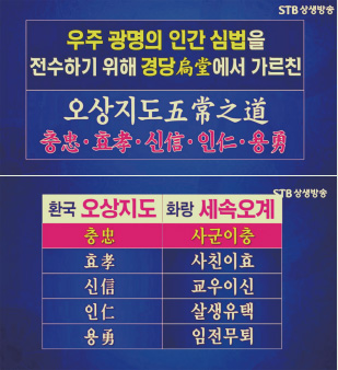 그 유명한 세속오계가 바로 임금을 섬기되 충으로(事君以忠), 부모를 섬기되 효로(事親以孝), 친구를 사귀되 믿음으로 하라(交友以信), 그리고 살아 있는 것을 죽일 때에는 가림이 있어야 한다(殺生有擇)는 것과 싸움에 나아가서는 물러섬이 없어야 한다(臨戰無退)는 것입니다. 충忠, 효孝, 신信, 의義, 용勇으로 대변되는 이 세속오계는 유가에서 온 것이 아니라 신교 경당문화에서 내려왔습니다. 『환단고기』에는 다음과 같이 기록되어 있습니다.