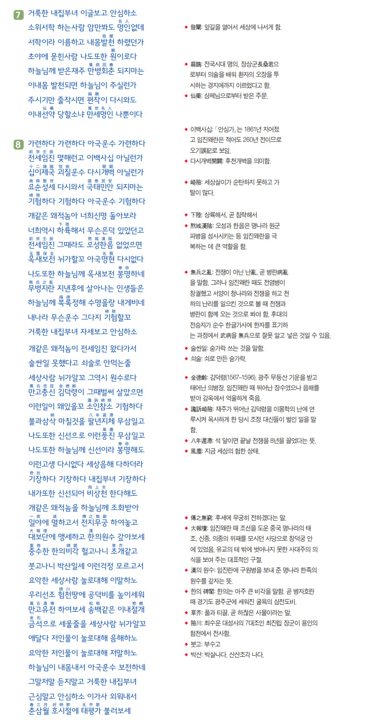 임진왜란 때 오성鰲城과 한음漢陰 같은 걸출한 인재들이 나와 나라를 지킬 수 있었지만, 김덕령金德齡 같은 만고충신을 음해해 죽여 버림으로써 석 달이면 끝날 전쟁을 8년이나 끌게 되었다고 했습니다. 그렇다면 장차 ‘십이제국 괴질운수’를 어떻게 극복할 것이며 인류를 구원하실 분은 누구인가 하는 이 문제에 대해 상제님이 대성사에게 무극대도를 내려서 괴질운수를 극복하게 하셨으니 근심 걱정을 하지 말라는 것입니다. 그리고 잘 알지도 못 하는 세상 사람들이 동학을 천주학이라 음해하는데 사실이 아니니 그런 말에 흔들리지 말라는 것입니다.
