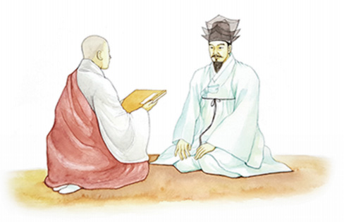 轉至丙辰仲夏之節(천지병진중하지절)에 謹奉幣帛與一箇僧(근봉폐백여일개승)하고 入于梁山通道天聖山(입우양산통도천성산)하야