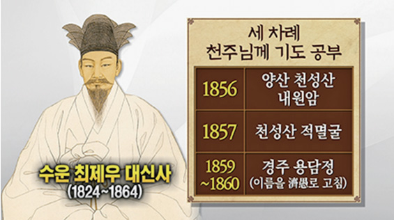 최수운 대성사는 1856(병진丙辰)년 5월 양산梁山 천성산天聖山에 올라 삼단으로 제단을 쌓고 폐백을 올린 다음, 49일 동안 한결같이 천주님이 강령하시어 천명과 신교를 내려 주길 지극정성으로 기도했습니다. 그러나, 숙부의 별세로 47일 만에 기도를 중단했습니다. 해가 바뀌어 1857(정사丁巳)년 7월 천성산 적멸굴寂滅窟에서 105일 기도를 새로 올렸습니다. 그리고 1859(기미己未)년 10월 울산에서 경주 용담으로 돌아와 수행을 지속했습니다. 1860년 2월 입춘시를 짓고 자호字號와 이름을 고친 다음 집중 기도를 드리던 가운데, 마침내 음력 4월 5일 아버지 상제님으로부터 도통을 받았습니다.