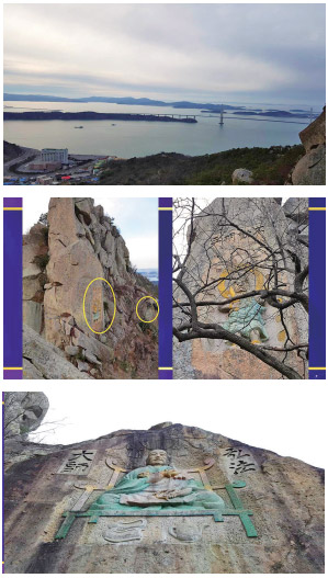 여기는 목포대교인데요. 유달산에 올라가서 찍은 겁니다. 옆에 중턱 사진에 보면 돌 있는 여기 오른쪽으로 돌아가면 이렇게 있어요. 이게 뭐냐면 암각을 해 놓은 건데 보니까 여기 부동명왕이라고 되어 있고, 거기 앞에는 홍법대사弘法大師로 불리는 구카이 스님이 있습니다. 전국에 있는 산 중에서 이렇게 암각화로 남아 있는 데는 유달산밖에 없어요. 홍법대사하고 부동명왕. 처음 가서 보고 참 신기해서 놀랐습니다.