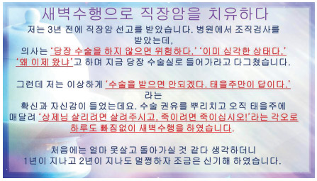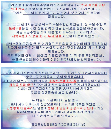 이것은 도공 수행의 치병 사례인데요, 이분이 정공과 도공을 함께 해서 암이 나았습니다. 그 결과 가족들이 같이 신앙을 하게 되었다는 내용입니다.