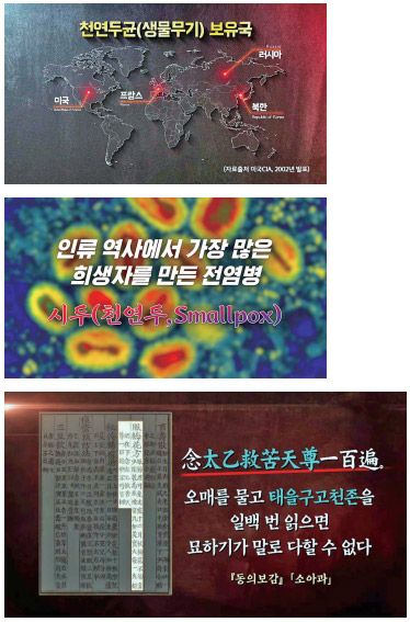 다가올 또 다른 병란에 대해 말씀드리겠습니다. 코로나뿐 아니라 앞으로 시두時痘(천연두)가 들어옵니다. “시두가 없다가 때가 되면 대발한다.”는 상제님 말씀(도전 7:63:8~9)이 있습니다. 1980년대에 인류 역사상 처음으로 전염병인 시두를 정복했습니다. 그런데 다시 대발한다는 겁니다. 어떻게 다시 대발하겠습니까. 지구상에는 지금 천연두균을 갖고 있는 나라가 있는데, 군사적으로 시두가 대발할 가능성이 있다 그렇게도 생각을 해 볼 수 있는 겁니다. 학자들도 앞으로 제일 무서운 거는 시두 바이러스라고 얘길 합니다. 분명한 가능성을 얘기하고 있습니다.