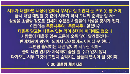 예전에 경제기획부 공무원으로 계시는 분에게서 전화가 왔어요. 자기가 수행을 하려고 여러 가지 책도 읽어 보고 하는데, 서울에도 절을 몇 개 가지고 있는 어떤 스님이 책을 읽어 보니까 제일 나중에 태을주가 있더라. 그래서 태을주를 막 찾다가 제 블로그에 들어와서 저한테 전화를 하셨어요. 태을주가 뭐냐 태을주를 알고 싶다. 그런 분이 계세요. 공부하신 분들은 결국에는 태을주를 찾습니다. 궁극에는 태을주 수행법입니다. 태을주가 태일을 성취하는 유일한 주문이기 때문입니다.