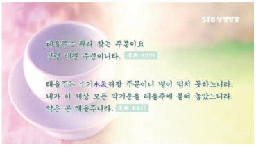 도전 3편 313장 7~8절의 성구를 같이 읽어 보겠습니다. “이 세상의 모든 약 기운을 태을주에 붙여 놓았나니 만병통치 태을주니라.” 또 4편 147장에는 “태을주는 수기 저장 주문이니 병이 범치 못하느니라.”는 말씀도 있습니다.