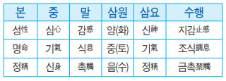 *3) 기존 수행서에서는 신을 성性, 기와 정을 명命에 배속하여 마음과 몸을 함께 닦는 성명쌍수性命雙修를 주장하고 있다. 그러나 신기정의 뿌리가 성명정이므로 성명정삼수性命精參修라고 하는 게 더 타당하다고 볼 수 있다.