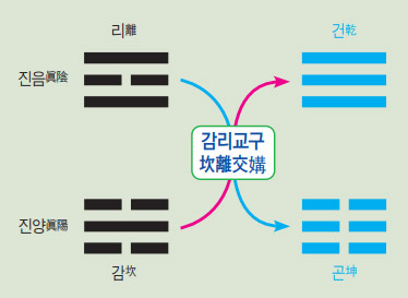 坎中陽爻原屬於乾(감중양효원속어건) 離中陰爻原屬於坤(이중음효원속어곤) 坎象來塡(감상래전) 離卦成乾(이괘성건)