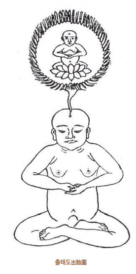 氣足胎圓(기족태원) 從頂而出(종정이출) 所謂形成出胎(소위형성출태) 親爲佛子者矣(친위불자자의)