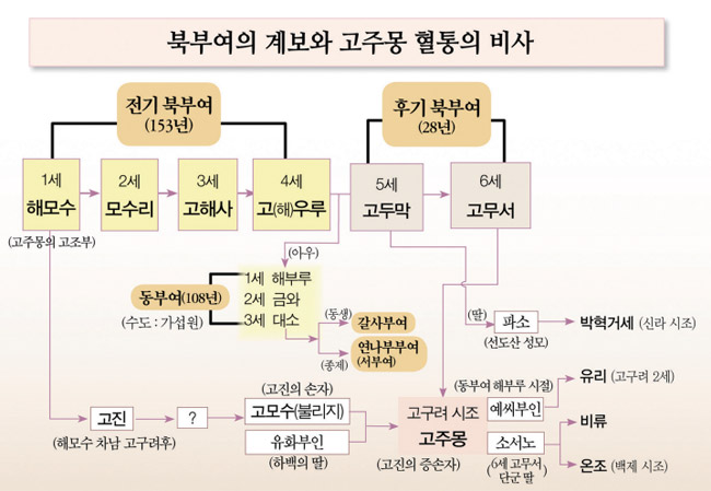 『환단고기』에 따르면 고주몽은 해모수의 5세손이다. 이 기록은 우리 고대사의 잃어버린 고리를 푸는 중요한 열쇠이다. 해모수의 해씨와 고구려의 고씨는 한 뿌리 성씨이다. 해解 자가 태양을 상징한다면, 고高 자 역시 높을 고 자로 태양과 연관이 있다. 부여라는 말 역시 태양과 관련이 있다. 해(日), 고高, 부여扶餘가 모두 태양과 관련된 성씨이다. 부여는 백제의 왕성이었다. 실제로 백제를 세운 비류와 온조는 고주몽의 둘째, 셋째 아들이다. 『환단고기』는 한韓·중中·일日의 고대 역사뿐만 아니라 성씨의 기원에 대해서도 중요한 단서를 제공하는 보물 같은 역사서이다.