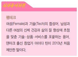 여성 건강을 위해 인공지능(AI)과 3차원(3D) 프린팅, 생명공학, 신소재 기술을 접목한 펨테크FemTech 기업들이 글로벌 스타트업 시장에서 주목받고 있다. 펨테크는 여성(female)과 기술(tech)의 합성어로, 여성 헬스케어와 라이프스타일에 맞춘 기술·상품·서비스를 뜻한다. 폐경기 여성을 위해 건강 조언을 해 주는 앱부터 유방암·자궁경부암 등 여성 암에 특화된 진단 기술을 개발하는 스타트업, 친환경 생리대를 만드는 업체까지 다양한 기업들이 출현하고 있다. 전문가들은 ‘펨테크는 인류의 절반이 여성이라는 점을 고려하면 엄청난 잠재력을 가진 시장’이라며 ‘여성 소비자의 힘이 커지고 있는 것도 긍정적인 부분’이라고 보도했다. 마우로 기옌Mauro F. Guillen은 그의 저서 『2030 축의 전환』에서 ‘2030년에는 전 세계 부의 절반 이상을 여성이 소유할 것이다’라고 전망했다. 글로벌 시장조사 업체 이머전리서치에 따르면 2019년 187억 5,000만 달러(약 21조 원)였던 펨테크 시장 규모는 2025년 380억 달러(50조), 2027년 600억 1,000만 달러로 매년 15~20%씩 성장할 전망이다.