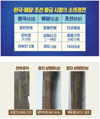 최근 아산牙山에서 성조운成造運이라는 이름이 적힌, 광무 9년(1905년)에 쓴 어느 암자의 상량문에서 「천부경」 문구가 발견되었습니다. 어느 암자에서 ‘일시무시일’, 「천부경」 첫 구절 다섯 글자가 나왔어요. 그리고 우주의 시작과 존재의 궁극 목적을 나타내는 ‘일적십거’까지 아홉 글자가 나왔습니다. 이 상량문을 쓴 지 6년 뒤인 1911년, 그러니까 조선 왕조가 망한 지 1년 뒤에 『환단고기』가 나왔습니다. 이 상량문은 『환단고기』 초판 30권이 간행된 사실을 시기적으로 뒷받침합니다.