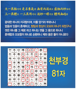 하경下經은 “일묘연一玅衍 만왕만래萬往萬來 용변부동본用變不動本 본심본태양本心本太陽 앙명昻明 인중천지일人中天地一 일종무종일一終無終一”입니다.