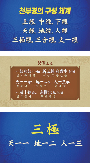「천부경」은 그 구성에 따라 세 부분으로 나눕니다. 삼수 원리로 ‘상경上經, 중경中經, 하경下經’ 또는 그 주제 언어를 가지고 ‘천지인’으로도 얘기합니다. 또 그 세 부분을 삼극경, 삼합경, 태일경이라 하기도 합니다.