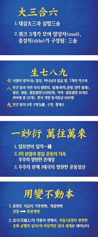 오늘날 우주론, 양자학 같은 첨단 과학으로도 우주의 어떤 궁극적 근원이나, 순환성과 영원성이라는 우주의 존재 방식이 제대로 해석되지 않을 때가 많습니다. 우주의 궁극적 기원에 들어가서 보면 특히 영零이나 무한대의 개념은 과학과 충돌되는 면이 있어요. 「천부경」은 이런 문제에 대한 답이 될 수 있습니다. 「천부경」을 우리 영혼의 가슴에 담고서 조용히 좀 더 깊이 있게 성찰하면서 진정으로 깨어나서 읽어 보면, 아주 재밌는 진리 정의와, 그 진리 주제 코드를 풀 수 있는 것입니다.