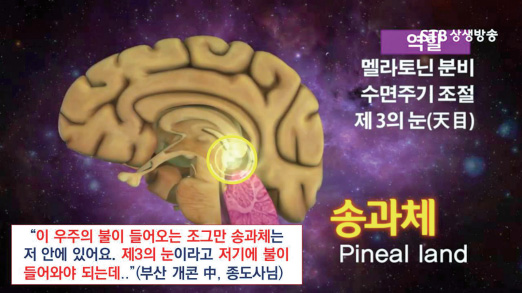 6월 22일 새벽 수행 시에는 상단전, 하단전으로 기운을 올리고 내리면서 도공을 하는데 저의 뇌 속이 투명하게 보였습니다. 인당과 연결된 송과체가 3D 화면으로 보였습니다. 마치 밥알처럼 보이는 송과체에 기운을 넣는다는 생각으로 도공을 하는데 마치 팔이 하늘을 나는 것 같았습니다.