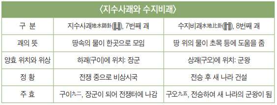 「서괘전」에 보면 “(지수사괘는) 많은 무리가 모이면 경쟁을 하게 되어 그다음에 수지비괘가 오게 되는데 비比에서는 서로 친하고 돕게 된다.”고 하였습니다. 그리고 수지비괘를 뒤집어 보면 바로 앞 지수사괘地水師卦(䷆)가 되므로 서로 도전倒顚 관계에 있습니다. 이 두 괘를 비교하면 아래 표와 같습니다.