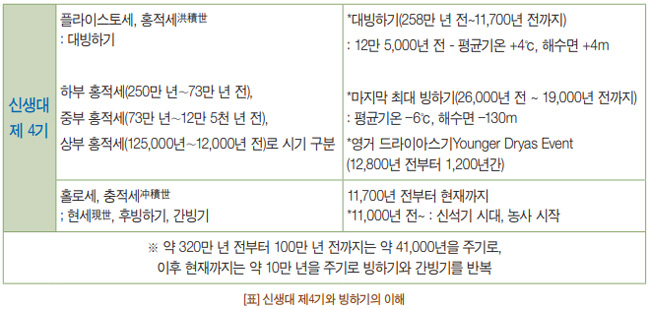 *8) 빙하시대는 250만 년 전에 시작되고, 하부 홍적세(250만 년∼73만 년 전), 중부 홍적세(73만 년∼12만 5천 년 전), 그리고 상부 홍적세(12만 5천 년∼1만 2천 년 전)의 시기로 구분된다. - 『한민족문화대백과사전』