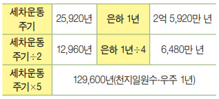 자전과 공전의 총운동 도수 129,600도를 5로 나누면 25,920도가 됩니다. 25,920도를 다시 2로 나누면 12,960도가 됩니다. 지난 호에서 알아본 것처럼 이 숫자에 년 단위를 붙이면 세차운동 주기를 얻을 수 있습니다. 세차운동은 기울어진 지축이 팽이처럼 회전하는 현상으로 한 바퀴를 도는 데 25,920년(약 26,000년)이 걸리고, 반 바퀴를 도는데 12,960년(약 13,000년)이 걸립니다. 여기에서 필자가 주목하는 건 세차운동 주기가 은하 1년으로 거론되는 2억 6,000만 년과 숫자의 양상이 유사하다는 것입니다. 공간과 마찬가지로 시간에서도 작은 구조가 전체 구조와 비슷한 형태로 끝없이 되풀이되는 프랙털fractal 구조가 동일하게 적용됩니다. 따라서 ‘은하 1년도 천지역수에 매여 있으며, 은하 1년의 참값(정도수正度數)은 2억 5,920만 년’에 달하는 게 아닐까 하는 것이 필자가 도출한 추론 결과입니다.