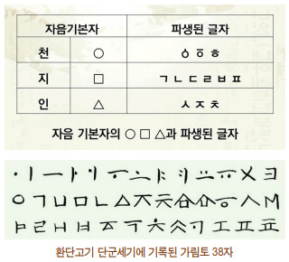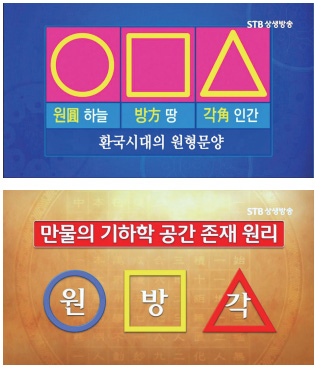 넷플릭스 <오징어 게임>은 제목 텍스트 디자인에도 원방각을 넣었다. 특히 자음에 원방각을 넣었는데, 대전대 윤창열 교수는 세계환단학회에 발표한 논문에서 원방각을 한글의 원형인 가림토加臨土의 자음과 연관시켜 바라보고 있다. 실제로 가림토 38자에는 ◯, □ 모양인 이응(ㅇ)과 미음(ㅁ)이 있는데 지금 한글에는 없는 △도 있다. <오징어 게임>을 연출한 황동혁 감독이 이런 고대 역사를 알고 했는지 알 수는 없으나 재미있게도 환단고기의 원형문화와 드라마의 원방각 상징이 잘 맞아떨어지고 있으니 흥미롭다.