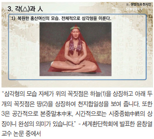 어머니 땅의 정신은 뭐냐. 아버지(하늘)의 생명과 씨를 받아서 어머니(땅)는 낳고 길러서 하늘의 뜻을 이룬다. 사람을 낳아서 기르는 것은 어머니 땅이다. 어머니의 본성이 뭐냐. 그것이 ‘방方’, 방정함이다. 바르고 반듯하다. 그러면 천지부모의 원만하고 방정한 신성과 생명의 본성을 가지고 태어난 인간의 정신을 상징한 게 삼각, 정삼각형. 여기에 인간의 생명의 본성과 인생의 궁극의 삶의 목적이 들어 있다. 이것을 천부경의 자연수로 얘기하면 하늘은 천일天一, 어머니 땅은 지일地一, 천지의 꿈을 이루는 인간은 ‘대한大韓’으로서 태일太一이다.