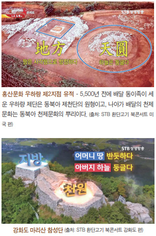 환단고기는 홍산문화의 주역이 환국과 배달국, 고조선 사람들이었다는 것을 알려 준다. 이곳의 우하량牛河粱 유적에는 사각형의 무덤군과 천제를 올리던 원형 제단이 발굴된다. 그런데 놀랍게도 전체 구조가 ‘하늘은 둥글고 땅은 방정하다’는 동양의 천원지방天圓地方 사상을 표현했다는 사실이다. 천원지방 구조는 고조선 때 지은 강화도 마리산의 참성단, 명나라 때 지은 북경의 환구단, 조선 말기에 고종 황제가 세운 원구단 등 고대의 천제문화 제천단祭天壇에서 공통적으로 나타난다.