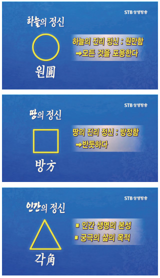 하늘광명과 땅광명과 인간광명, 이 우주 안에 살고 있는 모든 만물이 존재하는 유형의 구성 원리를 기하학적인 도형으로 나타낼 수 있다. 하늘은 원만하다. 하늘의 정신은 ‘원圓’으로 상징한다. 하늘의 진리 정신은 원만하다. 모든 것을 포용한다.