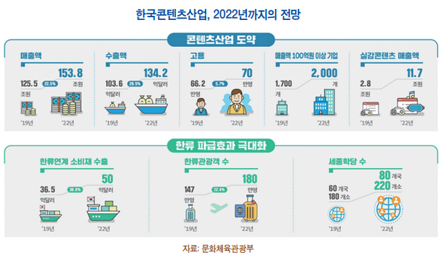 지난해 한국의 콘텐츠 수출 규모는 수출 효자 품목으로 꼽히는 화장품, 가전, 농산물의 규모를 넘어섰다. 한국문화콘텐츠진흥원에 따르면 2020년 콘텐츠 산업 수출은 전년 대비 6.2% 증가한 108억 달러로 집계됐다. 지난해 한국의 농산물과 화장품 수출 규모는 각각 90억 달러와 76억 달러였으며, 가전은 70억 달러를 기록했다. 아직 최대 수출품인 반도체(9,920억 달러)에 비하면 10분의 1 수준이지만 한국의 드라마, 영화, 음악, 게임, 출판물의 해외 확산에 의한 파생 효과와 잠재력은 그 규모를 가늠하기 힘들다.