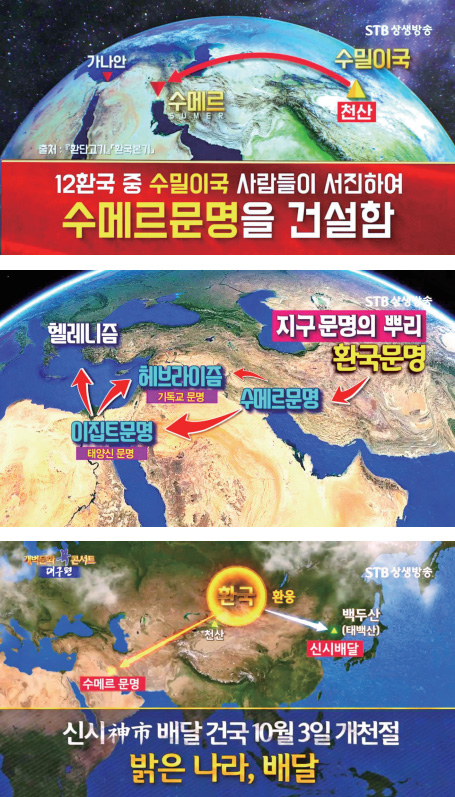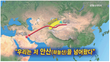 수메르의 창세 신화를 보면 수메르인은 후두부가 평평하고 머리카락이 검은 인종(black headed people)이다. 이는 전형적인 아시아 사람의 모습이다. 그리고 수메르의 점토판 기록에 따르면, 수메르인은 ‘안샨Anshan으로부터 넘어왔다’고 한다. 수메르 말로 안An은 하늘, 샨shan은 산을 의미한다. 그들이 넘어간 안샨은 곧 환국 문명의 중심이었던 천산天山과 동일한 말이다.