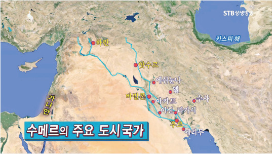 기독교의 원형 뿌리가 수메르 문명인데 이 사람들은 “우리는 저 안산(하늘산, 천산)을 넘어왔다.”고 합니다. 6천 년 전에 그곳을 넘어서 수메르 지역에 왔습니다. 그곳에 우르니, 도시국가 10여 개가 있는데 4천 년 전에 여기서 살던 기독교 믿음의 시조 구약의 아브라함이 전쟁이 일어나고 우르국이 망하려고 하니까, 자기 아버지를 모시고 여기를 떠나서 북방으로 갔다가 지금의 가나안 팔레스타인으로 들어갔습니다.