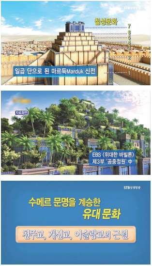 바빌론의 수도는 둘레만 20km였습니다. 18만 명이 살았으며 거리에는 인도, 중국, 지중해 연안 국가들로부터 온 상품들이 넘쳐 났습니다. 바빌론은 오늘날의 맨해튼Manhattan이었습니다. 바빌론의 왕 네브카드네자르 2세는 정복자이자 건설왕이기도 했습니다. 그는 바빌론이 세계 중심임을 입증하기 위해 탑을 건설했습니다. 그것이 바벨탑입니다. 탑은 순전히 흙으로만 건설됐으며 오늘날의 30층 높이와 맞먹습니다. 네브카드네자르 2세는 이 탑의 꼭대기에 도시의 주신인 마르둑을 안치했습니다. 마르둑은 모든 신들의 왕이기도 했습니다. 이 바벨탑보다 유명해진 건축물이 있었습니다. 네브카드네자르 2세가 신이 아닌 사랑하는 한 연인을 위해 건설했다는 이것, 바로 공중정원입니다. - EBS 위대한 바빌론 3부 공중정원