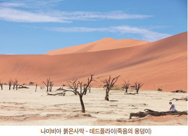 겉으로 보는 사막은 복잡한 면이 없이 단순한 아름다움을 보여 줍니다. 디자인이라는 것은 더 이상 뺄 것이 없을 때까지 빼는 것이잖아요. 사막이 그런 모습을 하고 있습니다. 사막의 약 80% 이상은 암반과 자갈로 되어 있습니다. 모래만 있는 곳은 얼마 안 됩니다. 유명한 곳을 몇 군데 들자면 우선 아프리카 나미비아의 붉은 사막에 죽음의 물웅덩이라는 곳이 있는데 보기만 해도 기가 막히죠. 사진을 안 찍을 수가 없습니다. 이집트에 있는 흑사막과 백사막은 멋있기도 하지만 지구의 오랜 역사를 간직하고 있습니다. 실크로드로 알려진 중국의 둔황과 투루판, 우루무치, 카스 같은 곳이 다 사막에 문명을 만들었던 곳이죠. 요르단의 와디럼은 너무 유명해서 영화 촬영 장소로 사용하고 있기도 합니다. 미국에도 사막이 꽤 넓은데요. 그중 모하비 사막에 있는 라스베이거스와 그랜드캐니언은 너무 유명하죠. 남미에는 연평균 강수량이 0.3mm밖에 안 되는 아타카마 사막이 유명합니다.