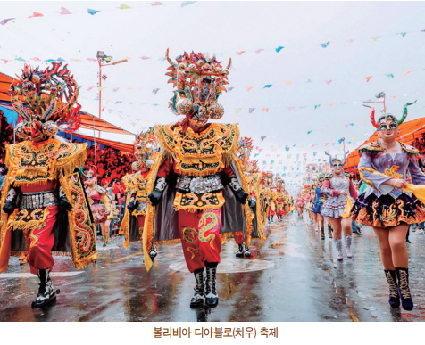 서양에서는 도깨비를 그린맨Greenman, 또는 잭인더그린Jack in the Green이라고 부릅니다. 예를 들어서 파리에 있는 노트르담 대성당 내부에도 있습니다. 용이 여기저기에 있기도 하고요. 인도에는 도깨비를 끼르티무카Kirtimukha라고 하는데 너무 많아서 그 숫자를 헤아릴 수가 없습니다. 멕시코의 모든 문명권에서도 발견이 됩니다. 그쪽에서는 틀라록Tlaloc이라고 부릅니다. 남미 안데스 문명권에서는 도깨비를 티오Tio 또는 티우Tiw라는 이름으로 불러 왔습니다. 티우(치우)는 최고의 신이었고 오늘날 볼리비아, 페루, 칠레에서는 매년 도깨비 축제를 합니다. 볼리비아에서는 악마의 축제라는 이름으로 불리며 디아블로Diablo 축제라고도 합니다. 기독교가 들어온 이후에 치우를 악마화시킨 축제이지만 치우 복장을 한 사람들 수천 명이 행진하는 장관을 보여 줍니다. 볼리비아 축제는 유네스코에 등록이 되어 있기 때문에 페루와 칠레에서는 다른 이름으로 이 치우 축제를 합니다. 남미의 3대 축제 중에 치우 축제가 2위 3위를 합니다. 1위는 브라질 리우데자네이루에서 벌어지는 리오 카니발Rio carnival이죠.