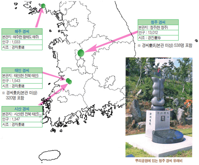 청주 경씨淸州慶氏는 2000년 인구조사에서 청주를 비롯하여 평택·청풍·부안·보성·장수·남원·경주·안동·상주·하동·정주·경성·경산 등 14본이 있는 것으로 조사되었으나, 청주 이외의 나머지 관향은 세거지명世居地名으로 문헌에는 청주 경씨 단본이다.
