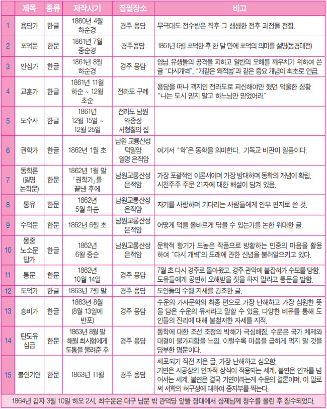 총 8편으로 이루어진 동학의 노래 『용담유사』는 한글 가사이기에 좀 더 쉽게 민중의 마음속으로 곧바로 파고들 수 있었다. 수운은 우리 한글로 자신의 생각을 민중과 소통하겠다는 위대한 발상을 했다. 표의문자인 한문과 표음문자인 한글이라는 양대 언어 양식을 동일한 무게로 취급하고, 심오한 사유를 두 언어 양식에 걸맞게 분산시켜 표현했다는 데 위대함이 있다. 이 사실 자체만으로도 당시 조선의 지식인들에게는 유례가 없는 사건이다. 수운의 인간적 면모와 개인적 삶과 생활의 질감이 묻어나는 사상 표현은 『용담유사』 쪽에 집약되어 있다.