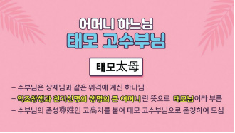 그리고 어머님 하느님 수부님을 태모太母님이라고 부릅니다. 수부님은 상제님과 같은 위격에 계신 하느님으로 억조창생과 천지신명의 생명의 큰 어머니란 뜻으로 클 태太 자를 붙여서 태모님이라고 부릅니다. 그리고 수부님의 존성이 고高씨여서 ‘태모 고 수부님(太母高首婦님)’ 이렇게 존칭하여 모시고 있습니다.
