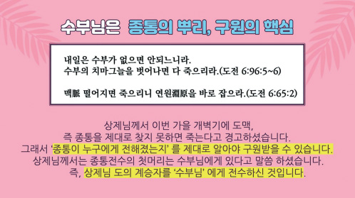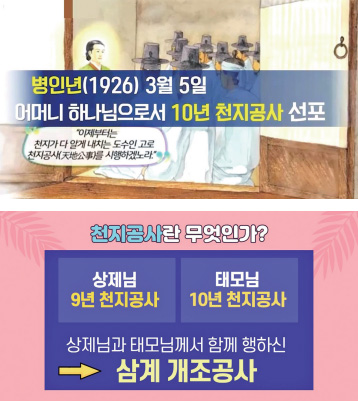 오늘은 인간으로 오신 어머니 하나님 수부님에 대해 공부를 해 봤고요. 다음 시간에는 두 분이 함께 보신 천지공사에 대해서 알아보도록 하겠습니다.