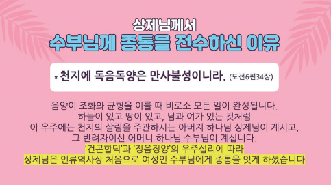 상제님께서는 “천지에 독음독양獨陰獨陽은 만사불성萬事不成이니라.” 이렇게 말씀하셨습니다, 독음독양은 음陰만 혼자 있고 또는 양陽만 혼자 있으니 모든 일을 이룰 수 없다는 것입니다. 즉 음양陰陽이 조화와 균형을 이룰 때 비로소 모든 일이 완성이 되는 게 천지의 이치입니다. 하늘이 있고 땅이 있고, 남자와 여자가 있는 것처럼, 이 우주에는 천지의 살림을 주관하시는 아버지 하나님 상제님이 계시고 그 반려자이신 어머니 하나님 수부님이 계십니다. 건곤합덕乾坤合德과 정음정양正陰正陽의 우주 섭리에 따라 상제님은 인류 역사상 처음으로 여성인 수부님에게 종통宗統을 잇게 하셨습니다.