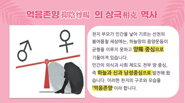 바로 천지부모天地父母가 인간을 낳아 기르는 선천先天의 봄 여름철 세상에는 하늘땅의 음양陰陽 운동이 균형을 이루지 못하고, 양陽 중심으로 기울어져 있습니다. 인간의 의식과 사회 제도도 전부 양陽 중심, 즉 하늘과 신과 남성 중심으로 발전해 왔습니다. 이러한 천지의 구조와 모습을 ‘억음존양’이라고 합니다.