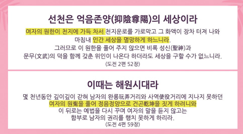 상제님과 태모님께서는 이 여성의 원과 한을 해소시켜 후천後天의 정음정양正陰正陽 세상을 만들기 위해 천지공사天地公事를 행하셨습니다. 최근에는 여성들이 사회 전반의 여러 영역에 진출해 ‘여장부女丈夫’들이 많이 등장하게 되었는데요, 이런 측면에서 현대 사회를 여성의 시대라고 평하는 견해도 있습니다. 하지만 전체적으로 보면 아직도 갈 길이 먼 것이 사실이고, 여성들이 활약하는 일부 현상들은 후천後天의 정음정양을 향해 가는 과정에서 나타나는 사회적 현상이라고 볼 수 있습니다.