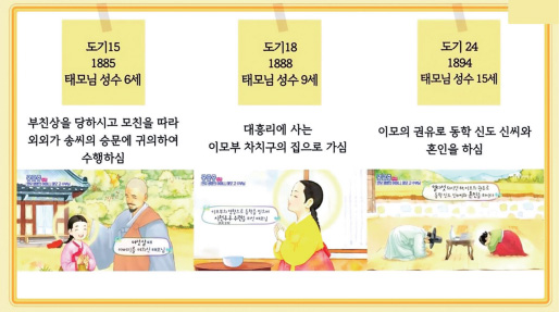 성수 15세 때에는 이모의 권유로 같은 동네에 사는 동학 신도 신씨申氏와 혼인을 하십니다. 그리고 딸 태종을 낳으시는데요. 신씨와는 13년 동안 사시고 사별을 하십니다. 그래서 태모님도 딸 태종과 함께 두 분만 남게 되셨죠.