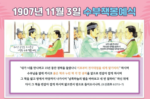 바로 태모님께서 깨어나시자 첫 말씀을 하셨는데, 태모님의 음성이 아니라 상제님의 음성으로 차경석 성도에게 “누구냐?”라고 물으신 겁니다. 그러니 차경석 성도님이 얼마나 놀라셨겠습니까. 그래서 “네 경석입니다.” 이렇게 대답을 하셨어요. 그러자, 태모님께서 “나는 낙종물을 맡으리니 그대는 이종물을 맡으라. 추수할 사람은 다시 있느니라.” 이렇게 말씀하셨습니다.