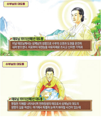 성모님께서 기묘(己卯 : 道紀 9, 1879)년 5월에 어느 절에서 기도하실 때 하루는 꿈에 높은 산에 올라 웅장한 집으로 들어가시니 한 선관仙官이 붉은 책과 누런 책을 한 권씩 주거늘 성모님께서 받으시고 놀라 깨어나시매 이로부터 잉태하여 태모님을 낳으시니라. (도전 11:2:5~7)
