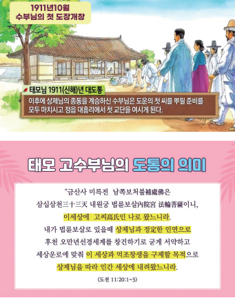 상제님의 종통을 계승하신 수부님은 도운의 첫 씨를 뿌릴 준비를 모두 마치시고 1911년 10월에 정읍 대흥리에서 첫 교단을 여시게 됩니다. 수부님의 첫 도장 개창입니다.