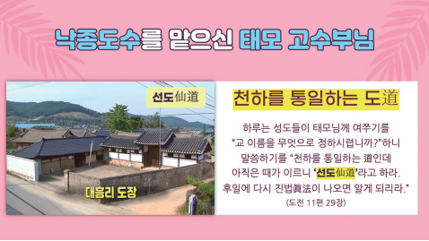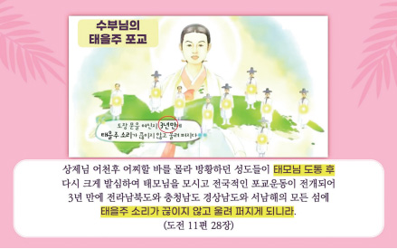 하지만 태모님께서 도통을 하시고 온갖 신이한 기적들을 펼치시니까 성도들에게 소문이 나서 모든 사람들이 물밀듯이 몰려오고, 그러면서 조직적인 포교가 전개되었습니다. 이후 3년 만에 전라남북도와 충청남도와 경상남도와 서남해의 모든 섬에 태을주 소리가 끊이지 않고 울려 퍼지게 되었습니다.