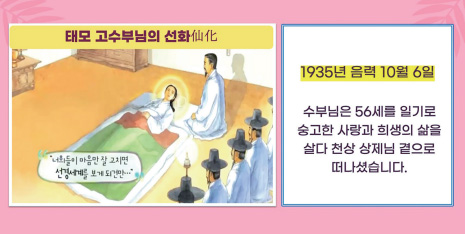 인간으로 다녀가신 우리의 어머니 태모님께서는 한평생 사랑과 희생으로 천하 창생을 건지기 위해 애를 쓰셨고, 한 많은 삶을 뒤로 하시고 성수 56세로 천상의 상제님 곁으로 떠나셨습니다.