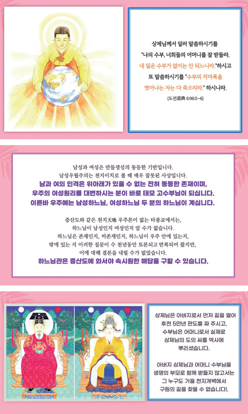 지금까지 우리는 ‘아버지 하느님, 상제님’만 계신 줄 알았는데, 증산도甑山道에서는 ‘어머니 하느님’을 얘기하고 있습니다. 결론적으로 말씀드리자면 이 우주에는 아버지 하느님만 계시는 것이 아니라 어머니 하느님도 계십니다.