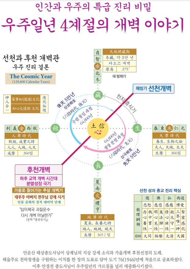 오늘 말씀의 결론은 ‘개벽’입니다. 천지의 계절이 바뀌는 대개벽입니다. 우주 1년 사계절에서 봄여름 세상, 선천 시간대가 끝나고 우주의 가을 겨울, 후천 세상이 닥쳐오는 가을개벽, 가을 천지개벽입니다. 후천개벽입니다.