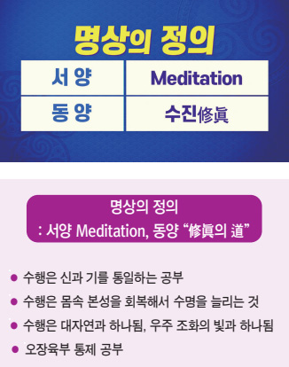 이 명상에 대해 동양에서는 대표적으로 선가禪家에서 ‘수진修眞의 도’라 했습니다. ‘참을 닦는 도’, 이것이 가장 대응이 잘 되는 말이에요. 그 외에 ‘수행’, ‘수도’ 또는 여러 가지 언어를 쓰는데 가장 멋진 언어는 수진입니다. 여기에 대한 만고의 명언이 있습니다. 선인仙人 광성자光成子가 전해 주신 말씀인데 ‘참이 아니면 선仙이 아니라는 것’입니다. 그래서 내 몸을 건강하고 빛의 몸으로 만드는 것은 단 한 글자, 참 진眞 자입니다.