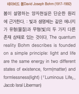 이 대우주 만유의 본성은 빛입니다. 데이비드 봄David Bohm은 ‘만물은 빛이 굳어진 것(All matter is frozen light.)’이라 했습니다. 지금 우리가 앉아 있는 의자라든지, 나무라든지, 시멘트, 모래알이든지 다 빛이라는 것입니다. 그리고 우리가 이런 문명을 연 것은 우주 속에 있는 요소의 4%를 안 데에 근거한 것이라 했습니다. 과학자들은 우주에 암흑 물질(Dark matter)이 있고 암흑 에너지(Dark energy)가 있다고 합니다. 이것은 어둡다는 것이 아니라, 우리가 모르기 때문에 과학자들이 다크dark라는 말을 붙인 것입니다. 그래서 다크 메터, 다크 에너지가 95% 전후라는 거예요. 이건 전혀 알 수가 없다는 뜻입니다. 그러나 데이비드 봄은 이것도 빛이라고 본 것입니다. 그래서 우주 안에 있는 모든 것은 빛이 유형과 무형으로 나타난 것이라고 정의했어요.