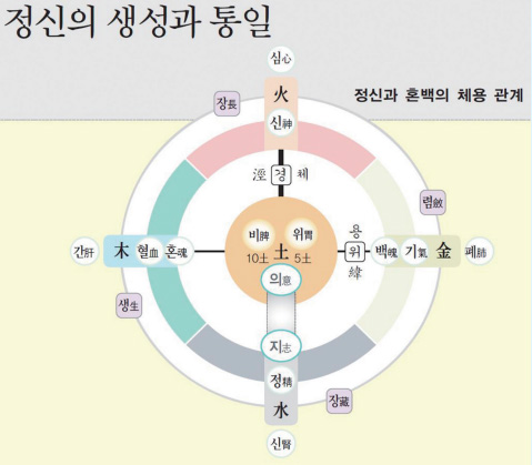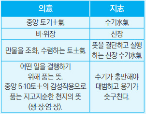 의지에서 ‘의’란 뜻 의意 자이며 토기土氣를 말한다. 이 ‘뜻’을 품는 것이 중요하고 그것을 결연하게 행동하는 것이 ‘지志’라는 것이다. 토기土氣를 주재하는 비·위장이 병들면 힘을 쓸 수 없게 되고, 수기水氣가 충만해야 강력하게 실천할 수 있게 된다. 이 의意와 지志가 합쳐져 ‘의지意志’가 생성되는 것이다.